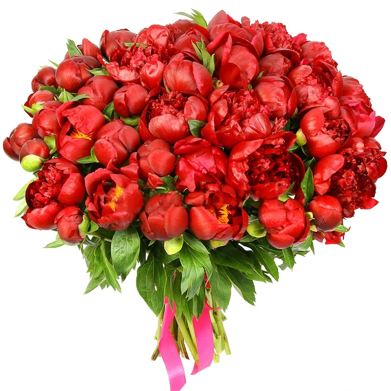Букет состоит из 51 красный пион, прозрачная упаковка, атласная лента.