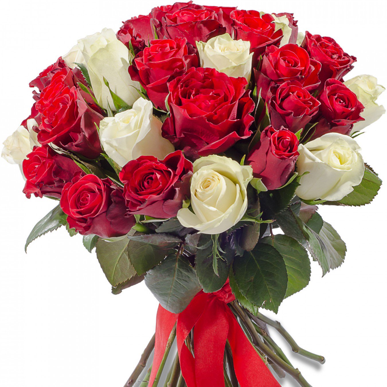 Букет состоит из 11 белых роз Кения, 10 красных роз Кения, прозрачная упаковка, атласная лента.