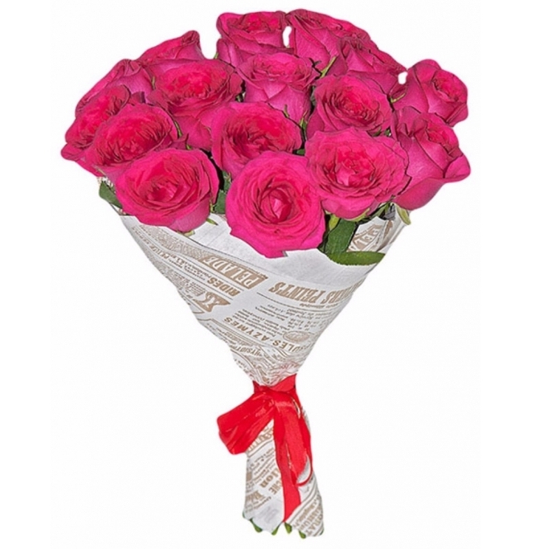 Букет состоит из 15 малиновых роз, крафт, атласная лента.