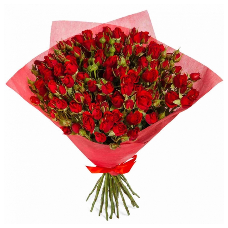 Букет состоит из 15 красных кустовых роз, красивая упаковка, атласная лента.