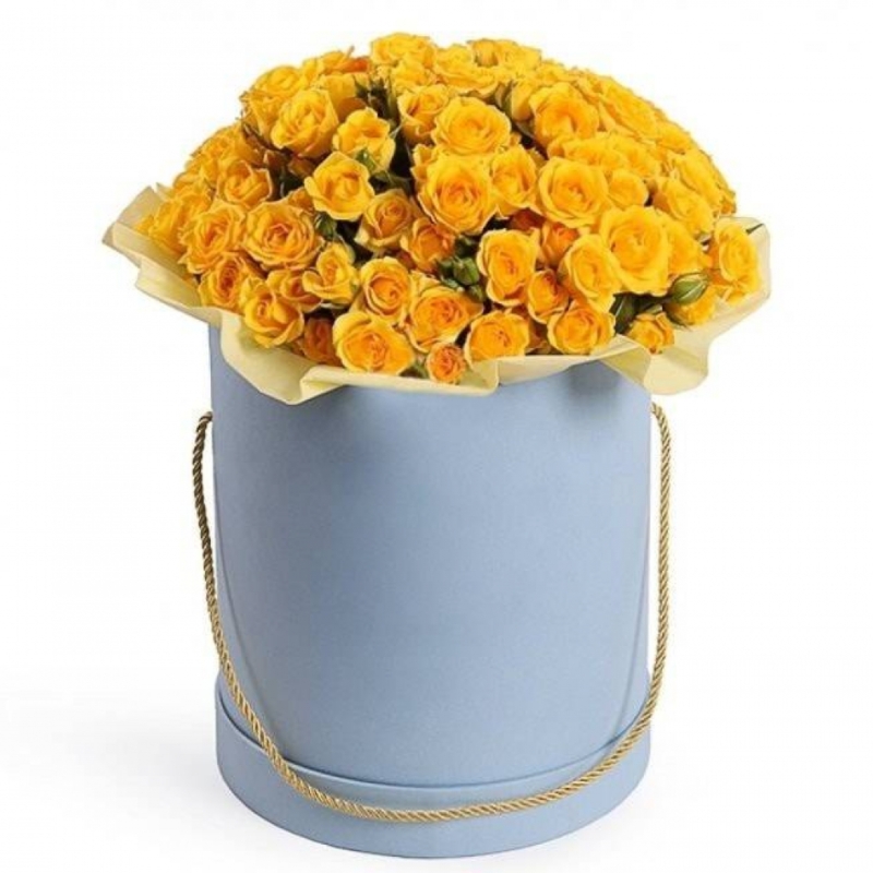 Букет состоит из 19 желтых кустовых роз, коробка, оазис.